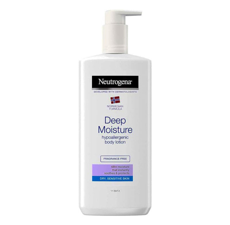 لوسیون بدن Deep Moisture پوست خشک و حساس نوتروژینا Neutrogena با آبرسانی مداوم و مرطوب نگه داشتن لایه های مختلف پوست محصولی ایده آل برای افرادی است که پوست خشک و حساس دارند و از قرمزی پوست رنج می برند. این لوسیون ماندگاری بالایی داشته و تاثیر آن بر روی پوست تا 48 ساعت باقی می ماند. یکی از مهم ترین ویژگی های این لوسیون قدرت جذب بسیار بالای آن است که سبب می شود که لوسیون موجب کثیف شدن لباس نگردد.
