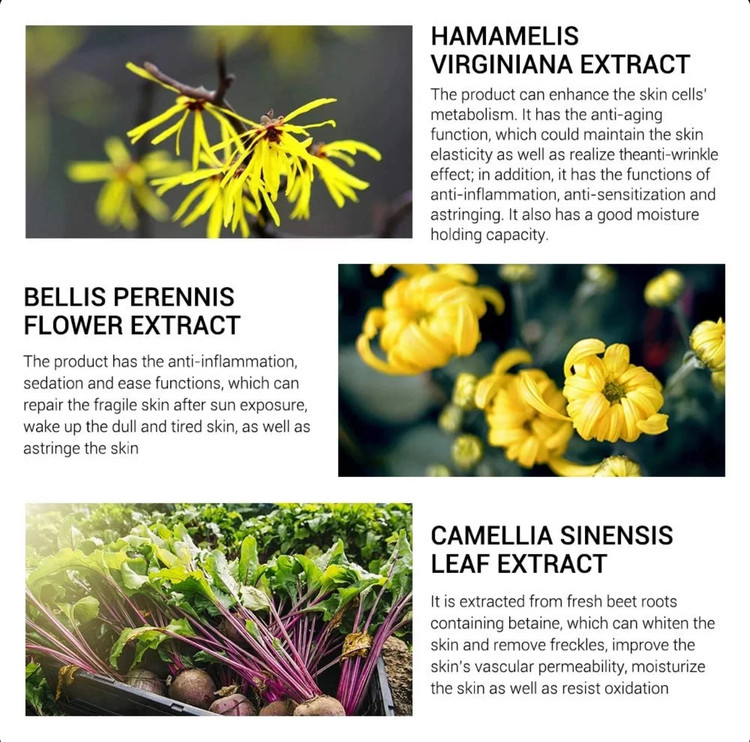 یکی از عصاره های موجود در این سرم عصاره گیاه WITCH HAZEL است که خواص فراوانی برای پوست داشته است از آن جمله میتوان به درمان قطعی منافذ باز ،جذب رطوبت ،کنترل چربی و...اشاره کرد این گیاه بدلیل فواید فراوان در طب سنتی چین استفاده بالایی دارد