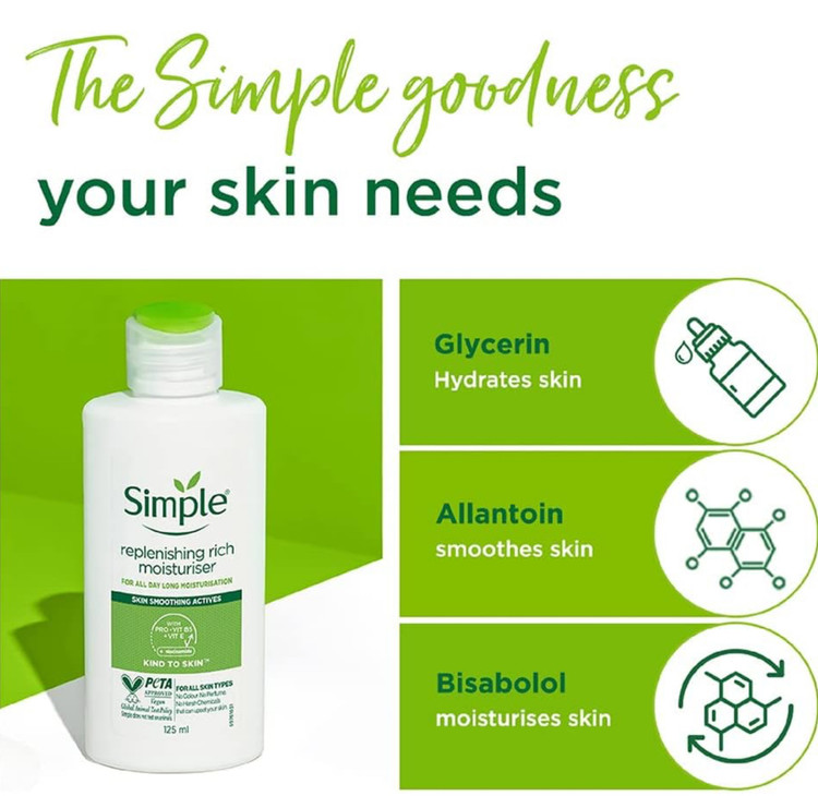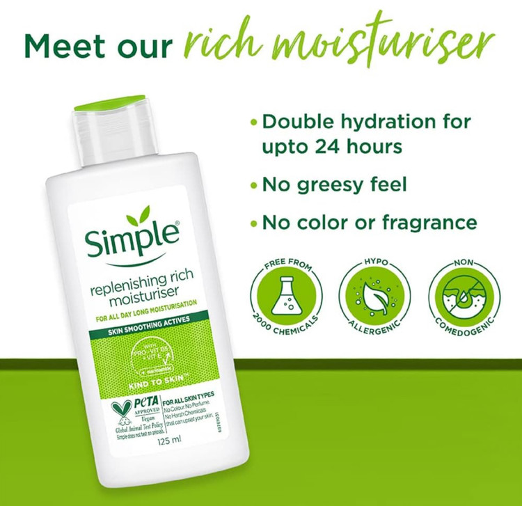 ویتامین پرو B5 و ویتامین E موجود در ترکیبات این محصول پوست را رطوبت رسانی و تغذیه رسانی می کند. همچنین غیر کمدون زا است و باعث مسدود شدن منافذ و ایجاد حساسیت نمی شود. آبرسان سیمپل برای پوست خشک، خیلی خشک و حساس ایده آل است و پوست شما را نرم و لطیف کرده و شادابی و درخششی طبیعی به آن هدیه می کند.
