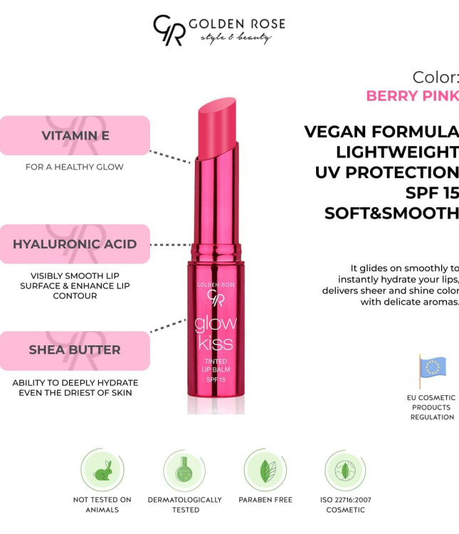 ویژگی های بالم لب رنگي glow kiss گلدن رز با SPF15: