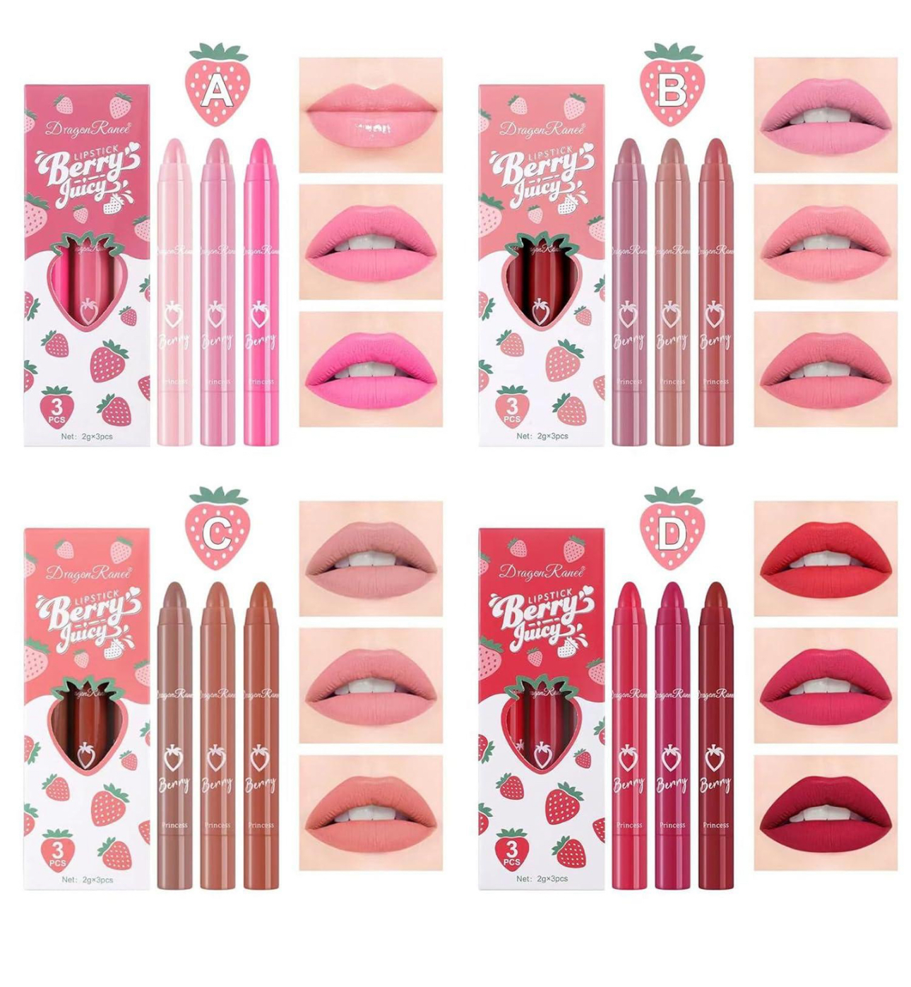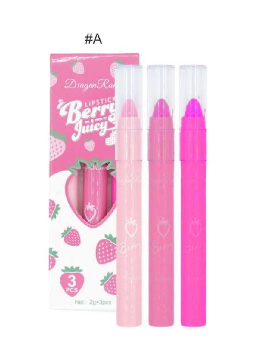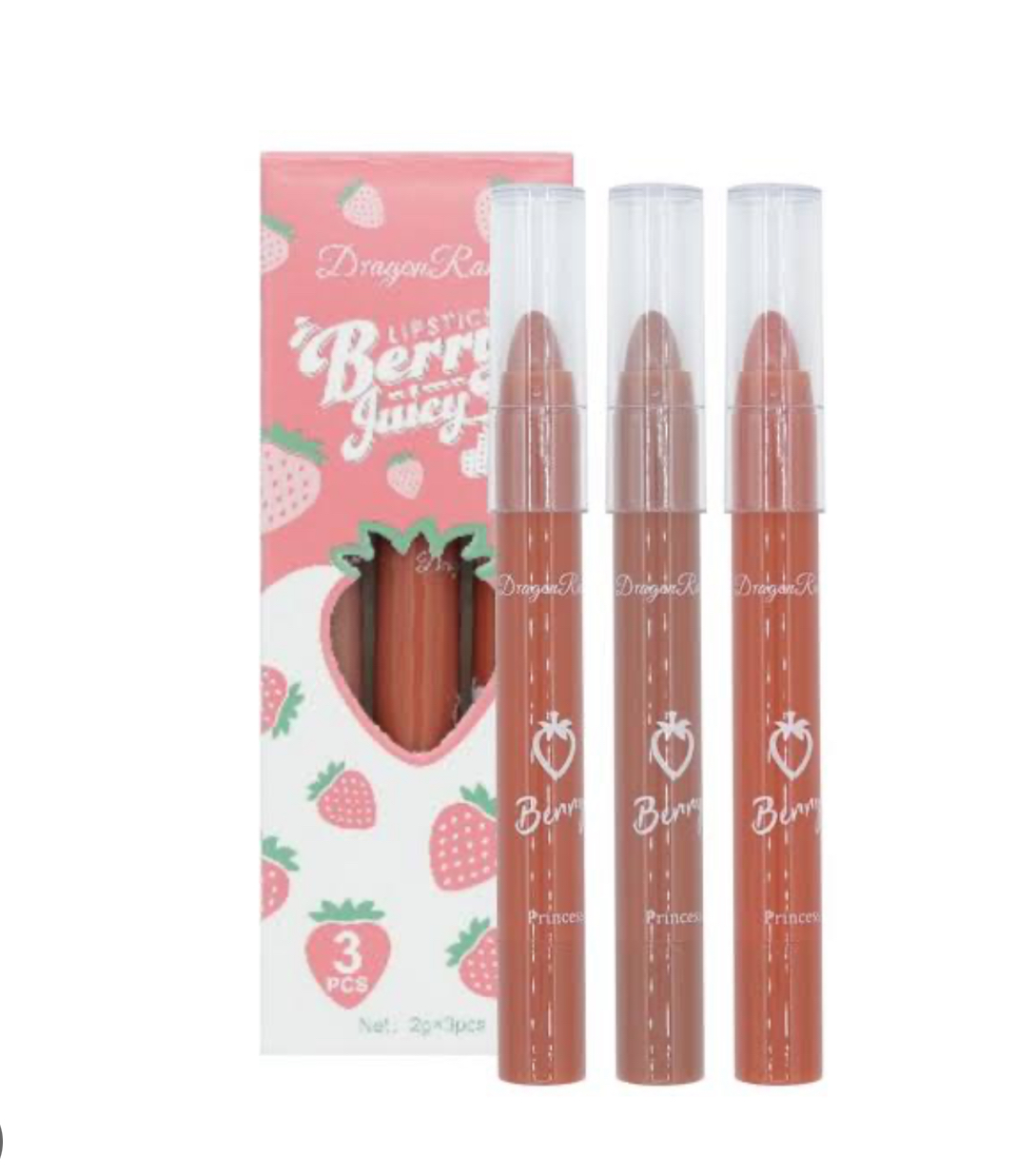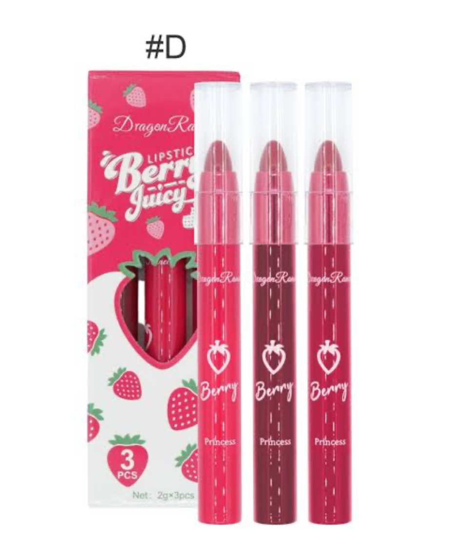 پک سه عددی رژلب مدادی جامد دراگون از کالکشن strawberry دارای 4 پک که هر پک 3 عدد رژ دارد محصول اورجینال از برند دراگون رانی بدون پوسته شدن روی لب ترک خوردن روی لب فینیش براق ماندگاری بالا